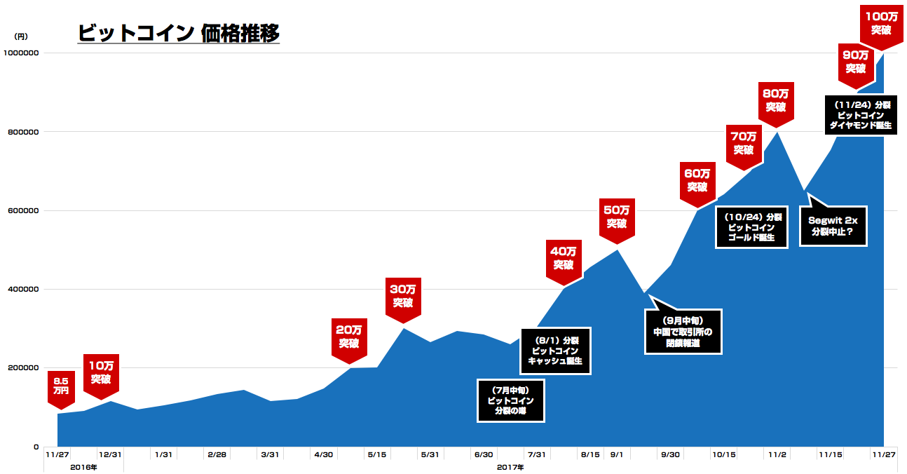 ここ数年で一気に話題になることが多くなった仮想通貨。その中でも代表的なコインであるビットコイン(BTC)は2009年に誕生したものになりますが、昨日、1BTCの価格がついに100万円を突破しました。ここ1年で大きく価格変動が起きておりますが、その推移とトピックスをザックリとまとめてみました。
