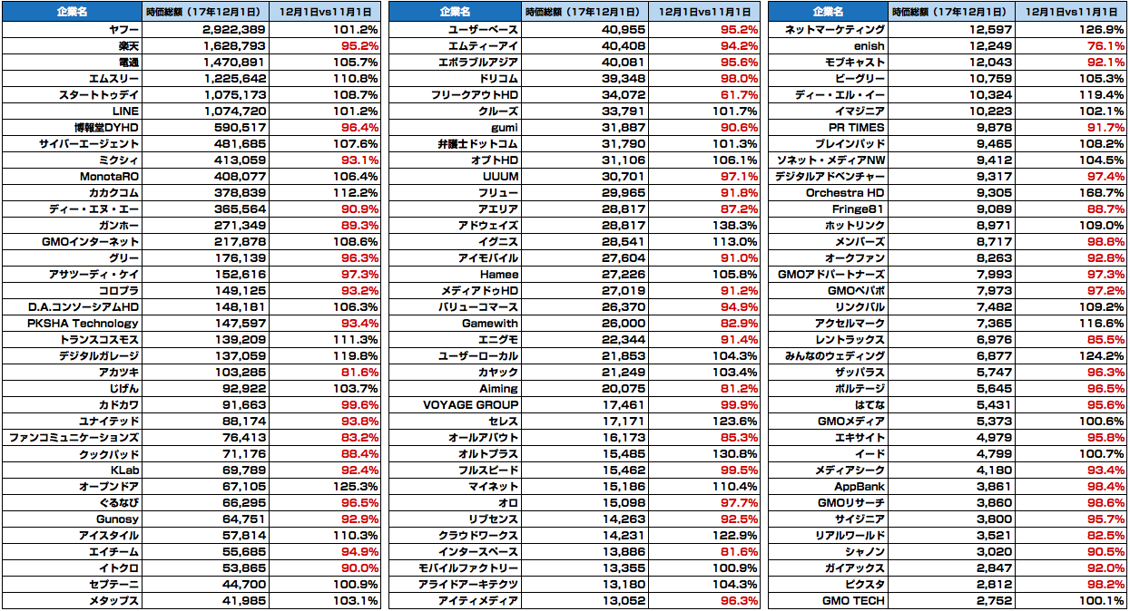 12月月初時点(2017年12/1終値ベース)での時価総額になります。全108社。11月月初との対比で見ると、上げと下げ半々といったところ。特に上げた企業で見ると、Orchestra HD(168.7%)オルトプラス(130.8%)セレス(123.6%)オープンドア(125.3%)クラウドワークス(122.9%)みんなのウェディング(124.2%)あたりでしょうか。