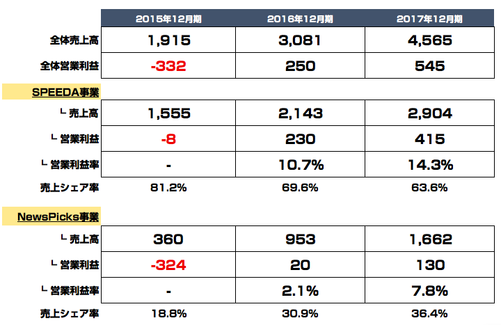 同社は大きく分けて「SPEEDA事業」と「NewsPicks事業」の2事業。両事業伸びておりますが、特にNewsPicks事業の伸びが著しく、売上シェアも徐々に増えてきております。利益率も向上してますね。(SPEEDAもですが)
