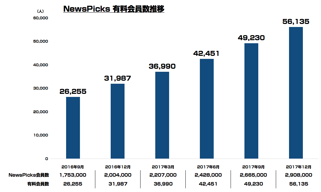 NewsPicksの数字が伸びている要因の一つとして挙げられるのが、有料会員ユーザーの増加。IR資料上ですと、広告売上と半々に近いシェア率となっていそうです。