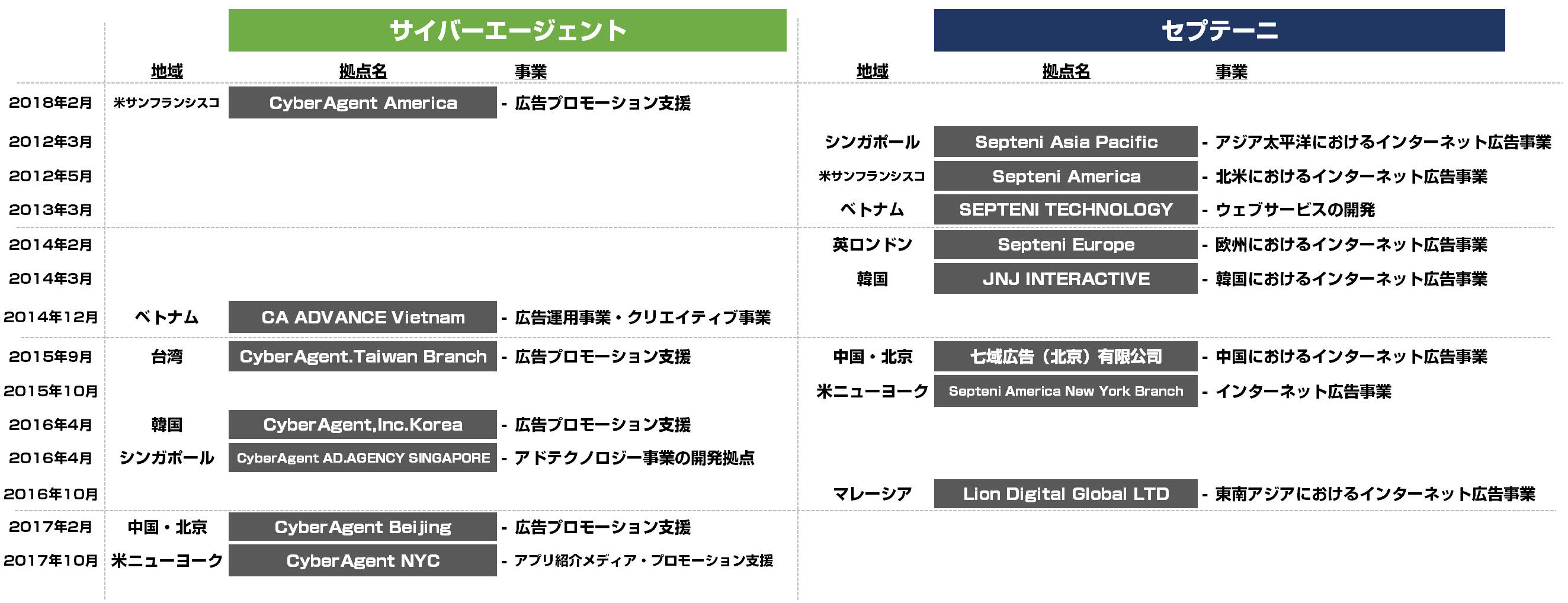 公式リリースから拾うと、サイバーエージェントが7拠点、セプテーニが8拠点となっております。改めて整理してみますと、展開拠点は両社ともに似ております。あくまで公式リリースベースですが、セプテーニがヨーロッパで展開(ロンドン拠点)しているので、その点が異なるくらいでしょうか。