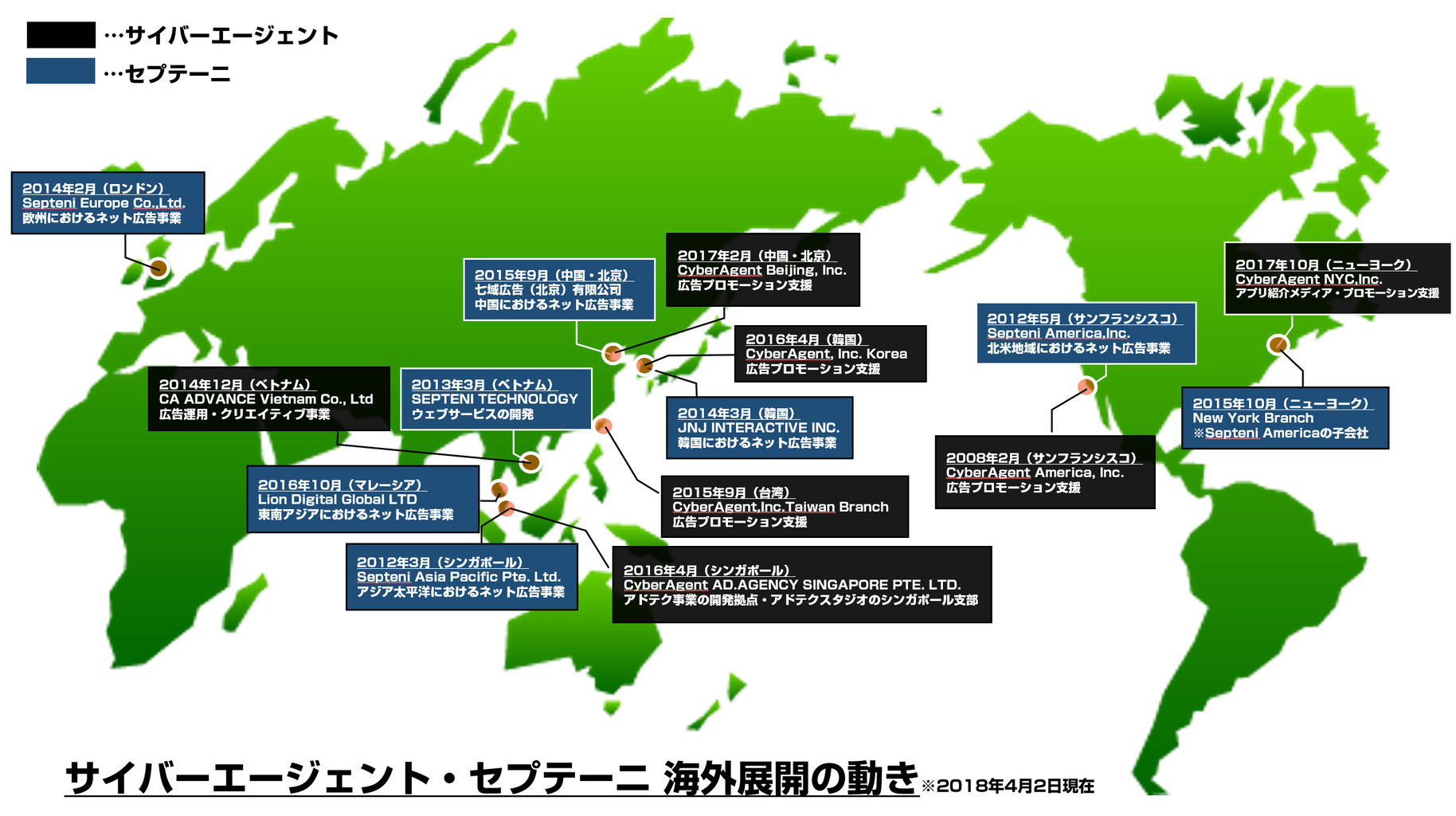 先日、サイバーエージェントが新たな海外拠点開設のリリースが出まして、ニューヨークにオフィスを構えるとのこと。同社としては海外7拠点目になりますが、これまでの海外展開が気になったので軽く触れてみたいと思います。せっかくなので業態の近しいセプテーニの海外展開も振り返ってみます。