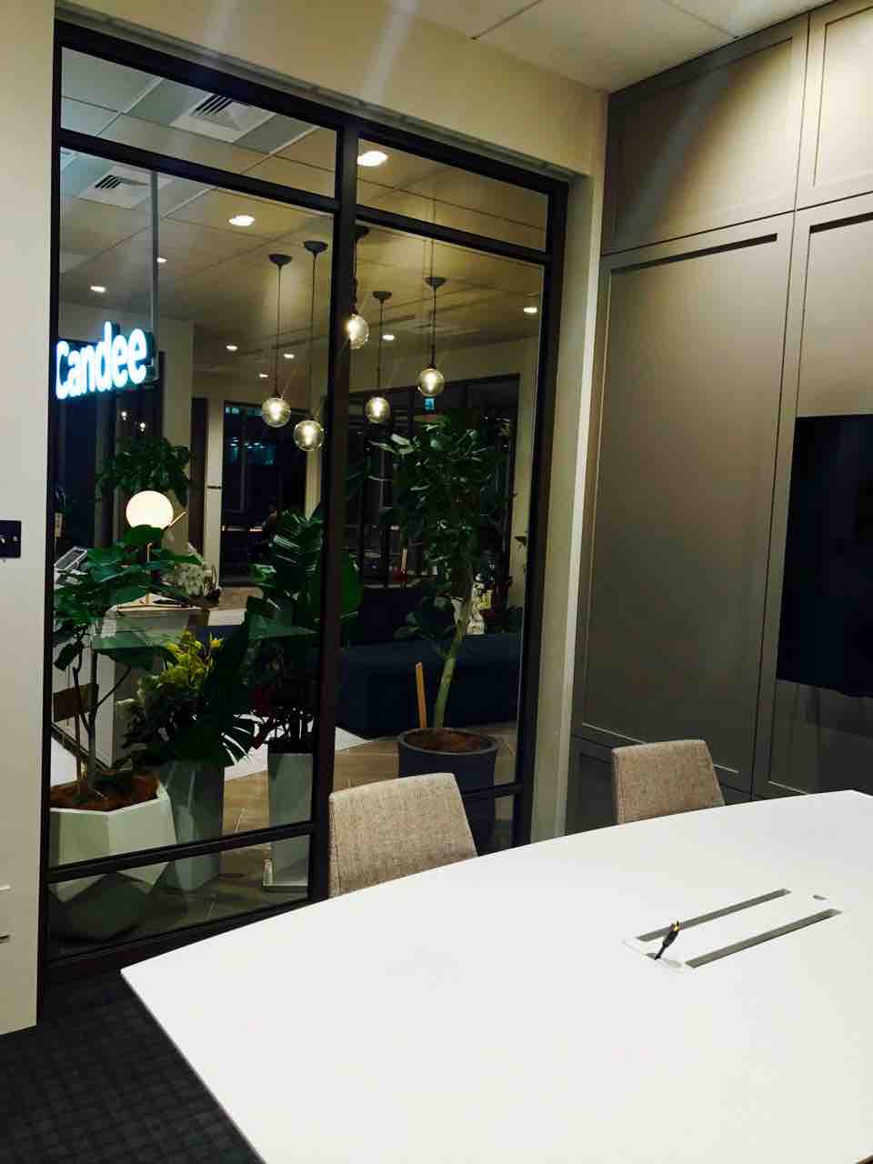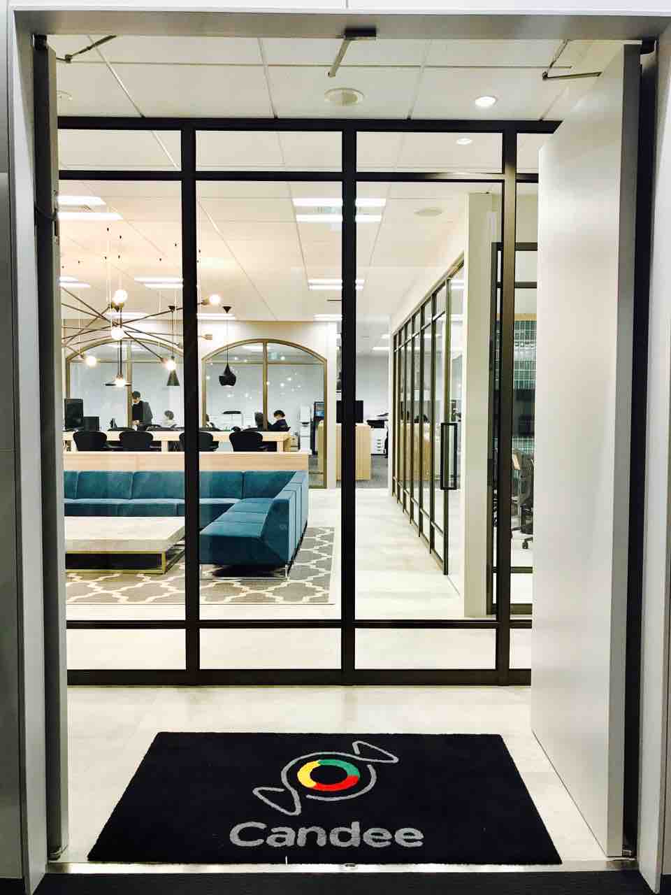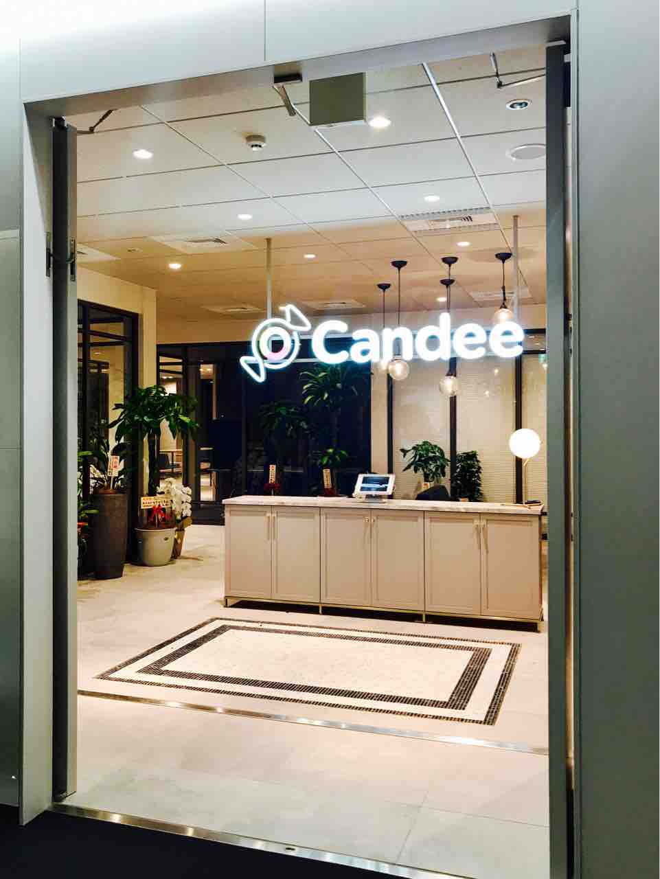 ヒューリック南青山ビルの2フロアがオフィスになりますが、まずは5Fのエントランスから。エレベーターを降りた瞬間に”Candee”が煌々と光り輝いております。