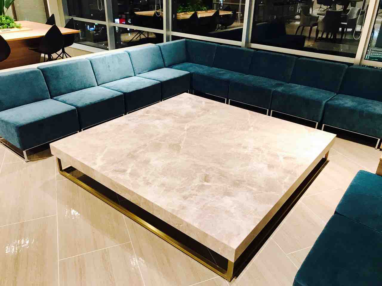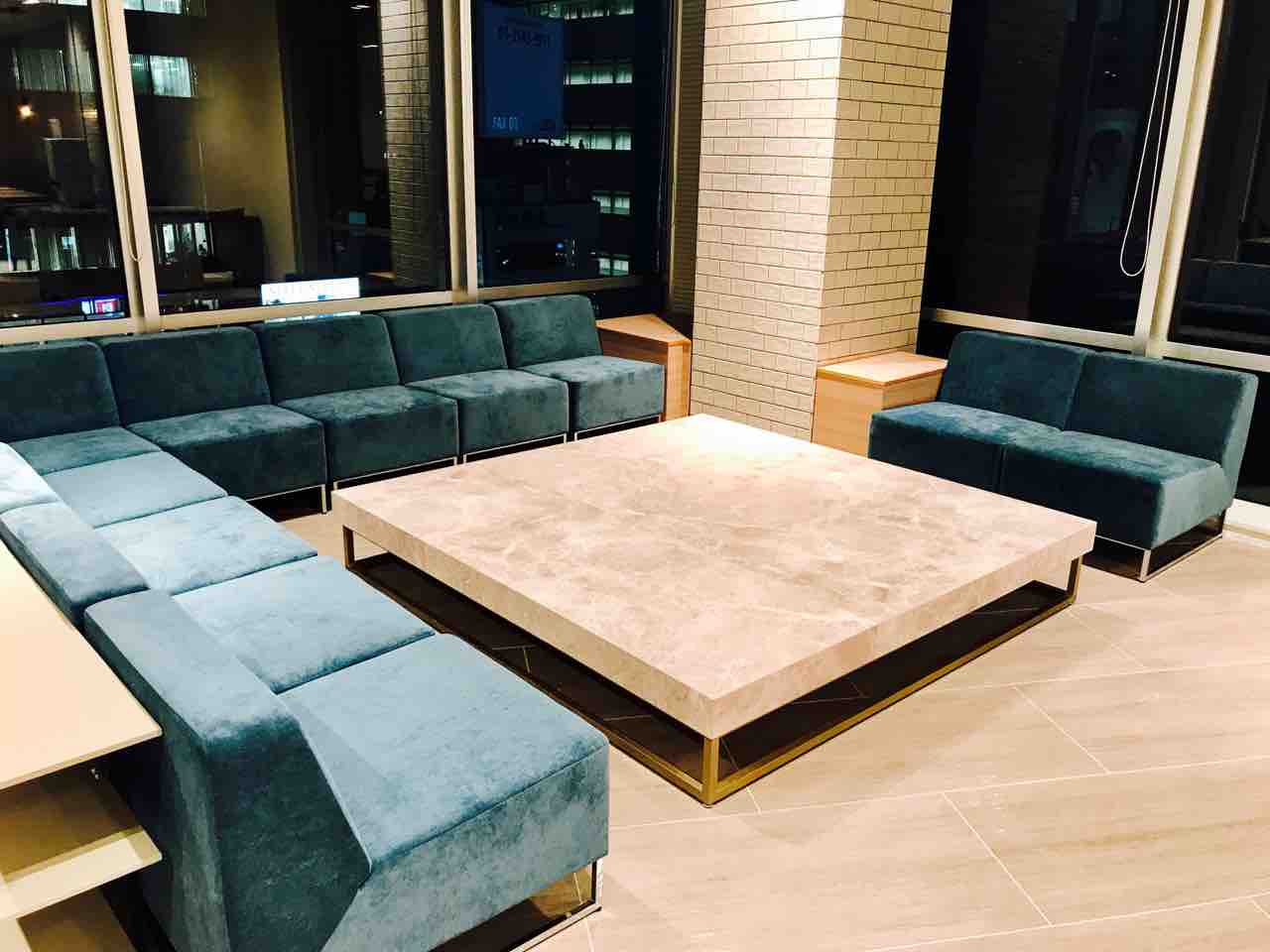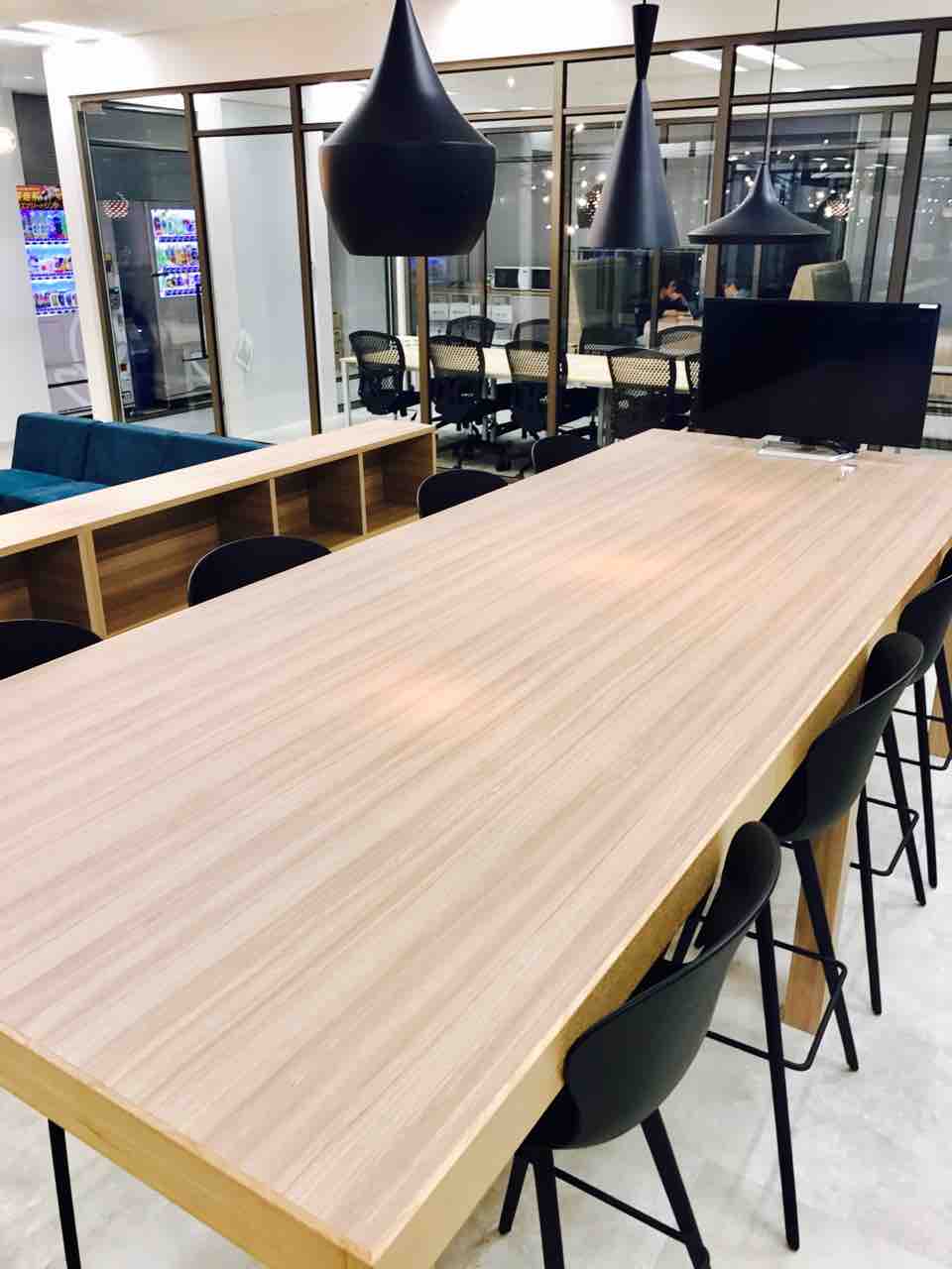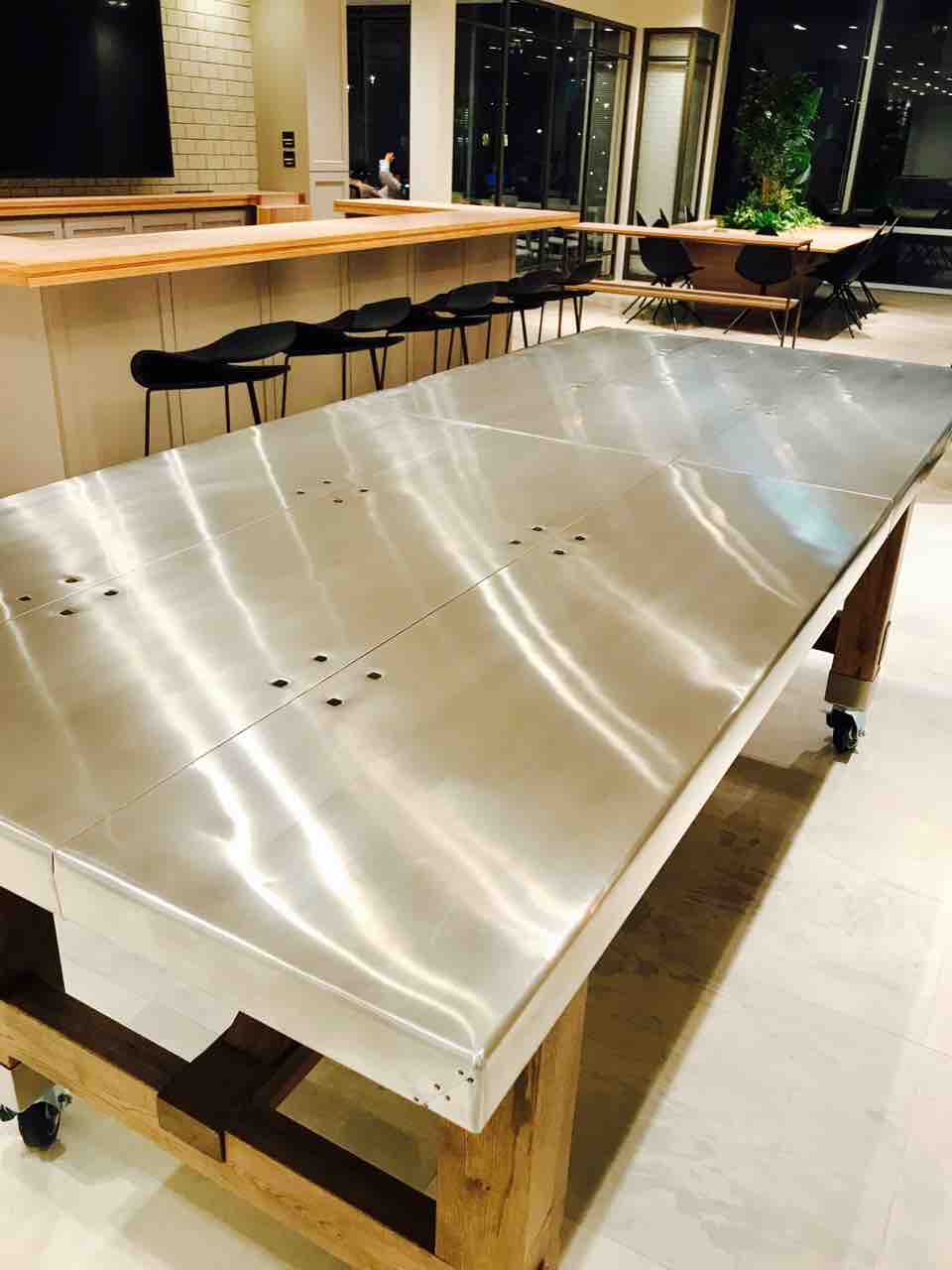 フリースペース 真ん中にあるアルミ製の大テーブル。パーティーや全社の集まりでケータリングを使う時などにもってこいですね。