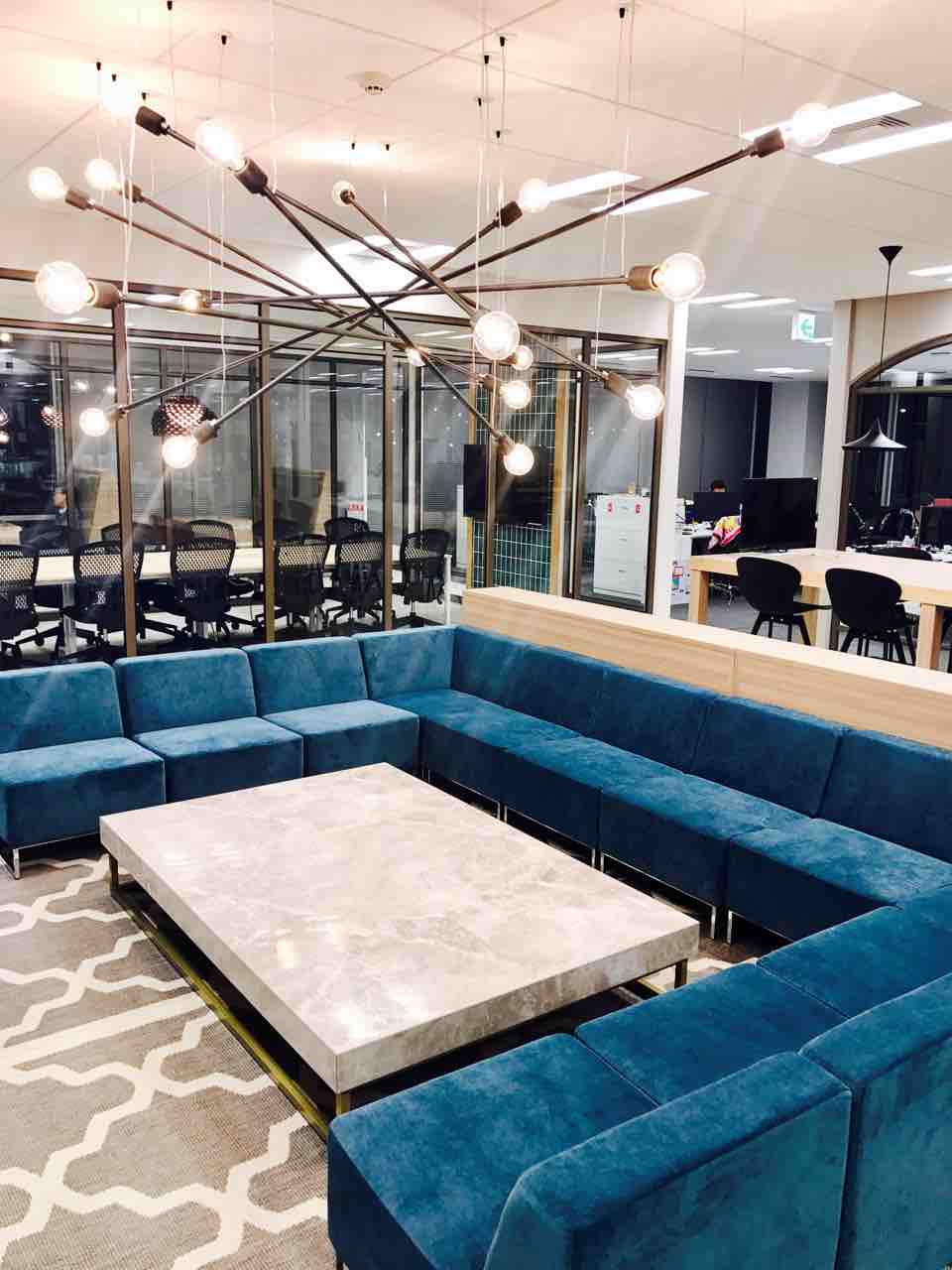 執務スペースなのですが、入るといきなりソファー席が。”オフィス感を出さない”オフィス作りを心掛けたようで、入ってすぐにフリースペースを設置しているようです。
