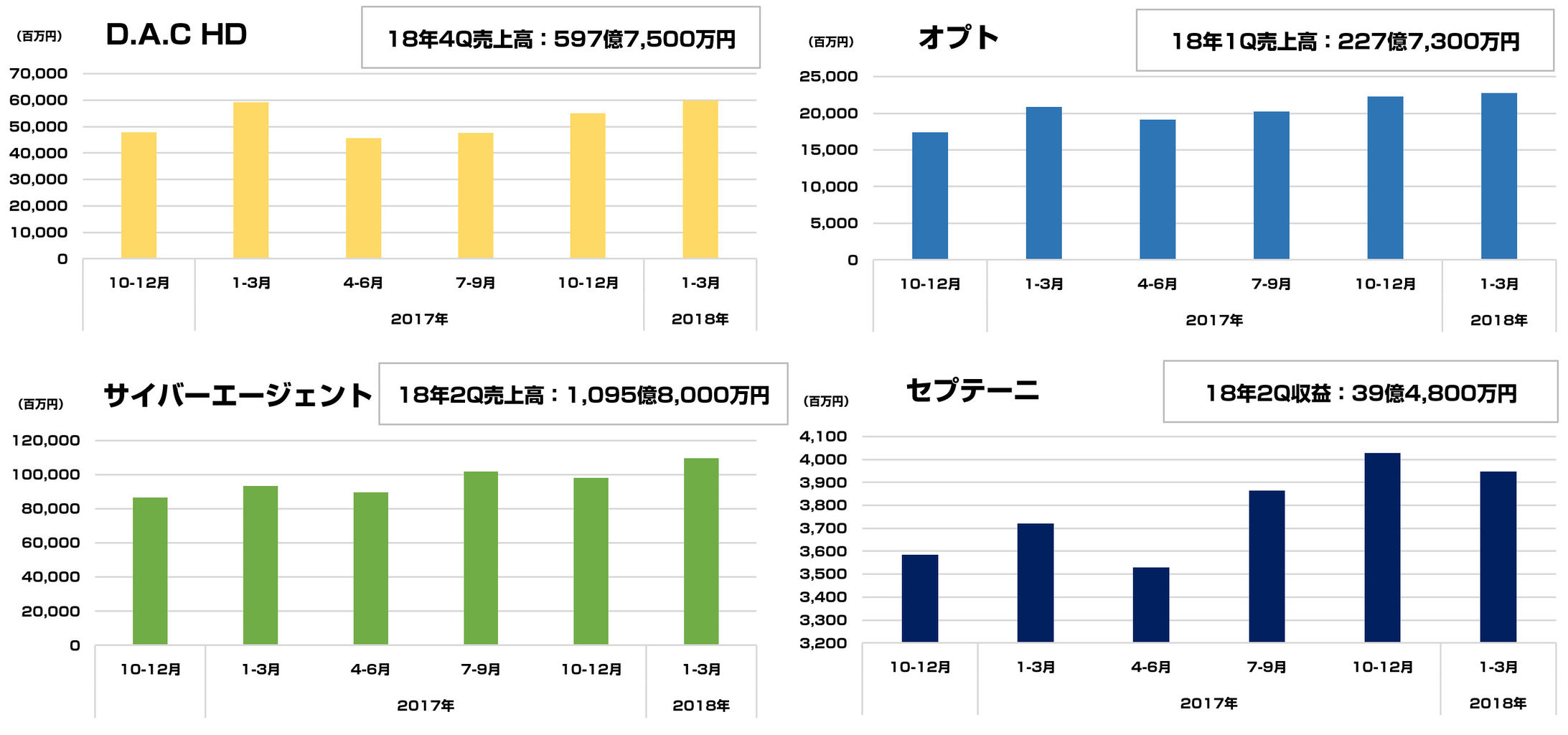 暑くなったと思ったら寒くなったりとよくわからない気候ですが、決算の方は劇的に熱くなっております。ということで、今回はQに1度の定期エントリーを。オプト/サイバーエージェント/セプテーニ/D.A.Cホールディングス4社の決算(2018年1-3月)のポイントを簡単にまとめてみました。それでは、いきます。