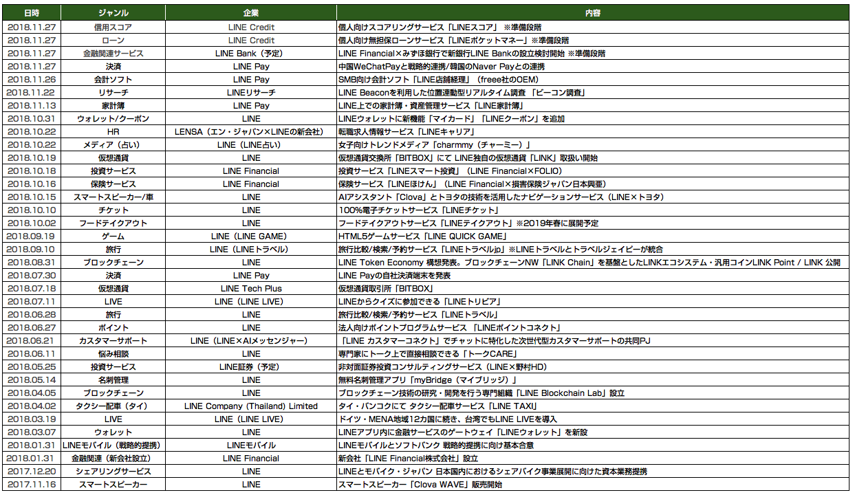 最近の業界ニュースでの注目トピックスの一つとして、LINEにおける攻めのサービス展開があります。ここ最近の”サービス開始(および検討)” 系リリースラッシュは本当にすごいなと思います。リリースが多い企業はよくありますが、サービス開始がここまで続く企業は珍しいかと思います。そんなこんなで、気になったので LINEがこの1年でどんなサービスを生み出してきたのかリリースベースで振り返りたいと思います。