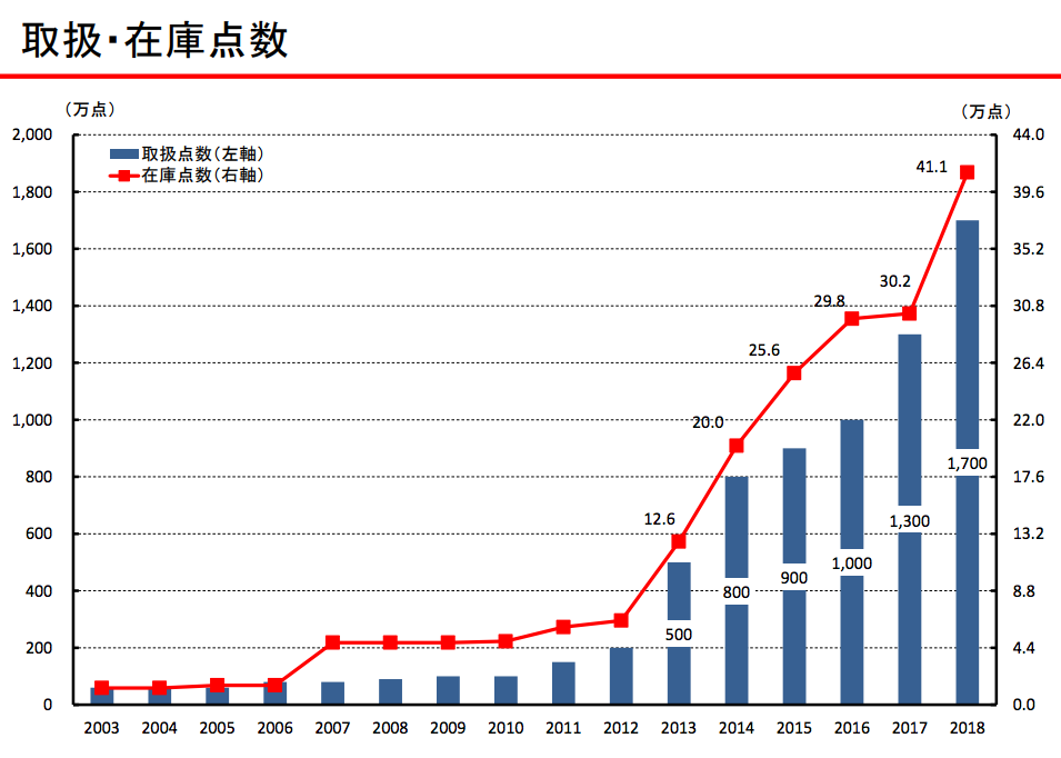 取扱・在庫点数も伸びており、2018年期末には取扱点数1700万点となっております。