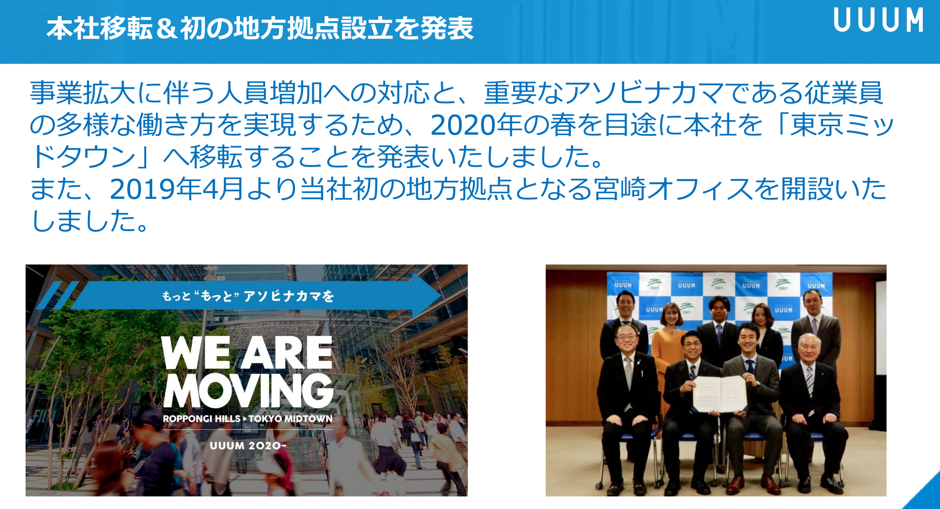 トピックスですが、好調ぶりが伺えるかのように 本社移転とUUUM初の地方拠点設立が発表されております。本社の場所はミッドタウンへ移動とのこと。また、初の地方拠点については宮崎に開設。