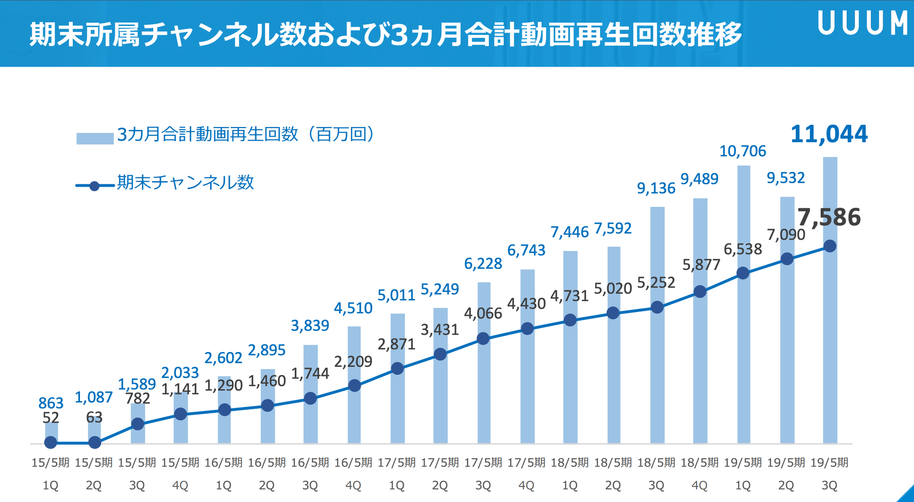 Q毎の動画再生回数の推移。2Qでは下がりましたが、3Qで大きく伸ばしてきて過去最高の111億4,400万回再生 ※3カ月合計動画再生回数 を記録しております。チャンネル数に関しては7,586。