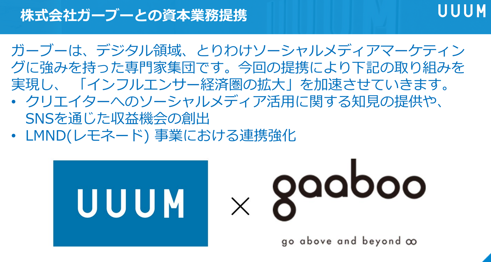 続いては提携の話題。ソーシャルメディアマーケティングに強みを持つガーブーとの資本業務提携が発表されております。2018年11月に買収しLMND(レモネード)との連携も強化されることから、インフルエンサー経済圏の拡大がさらに加速していきそうです。