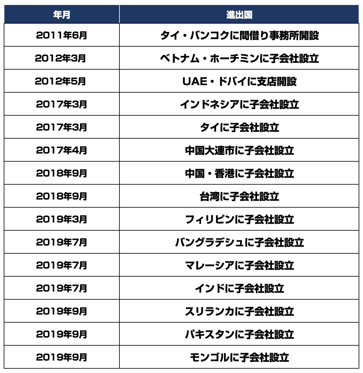 上記、リリースおよび公式サイトに記載のあったもののみを記載させていただきました。2011年-2012年で3拠点を開設しておりますが、2017年以降では12拠点(ユニーク数としては中国に被りがありますが)。特に今年2019年だけで見ますと 7拠点を開設しておりまして、海外展開が加速しております。