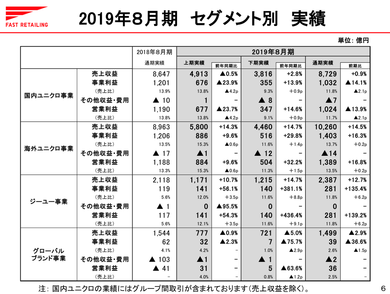 こちらがセグメント別です。以下テキストがサマリーですが、こうして見ると海外の成長が著しいですね。前期比で見ると、海外ユニクロ事業の収益性が全セグメントの中で最も高くなったことがわかります。