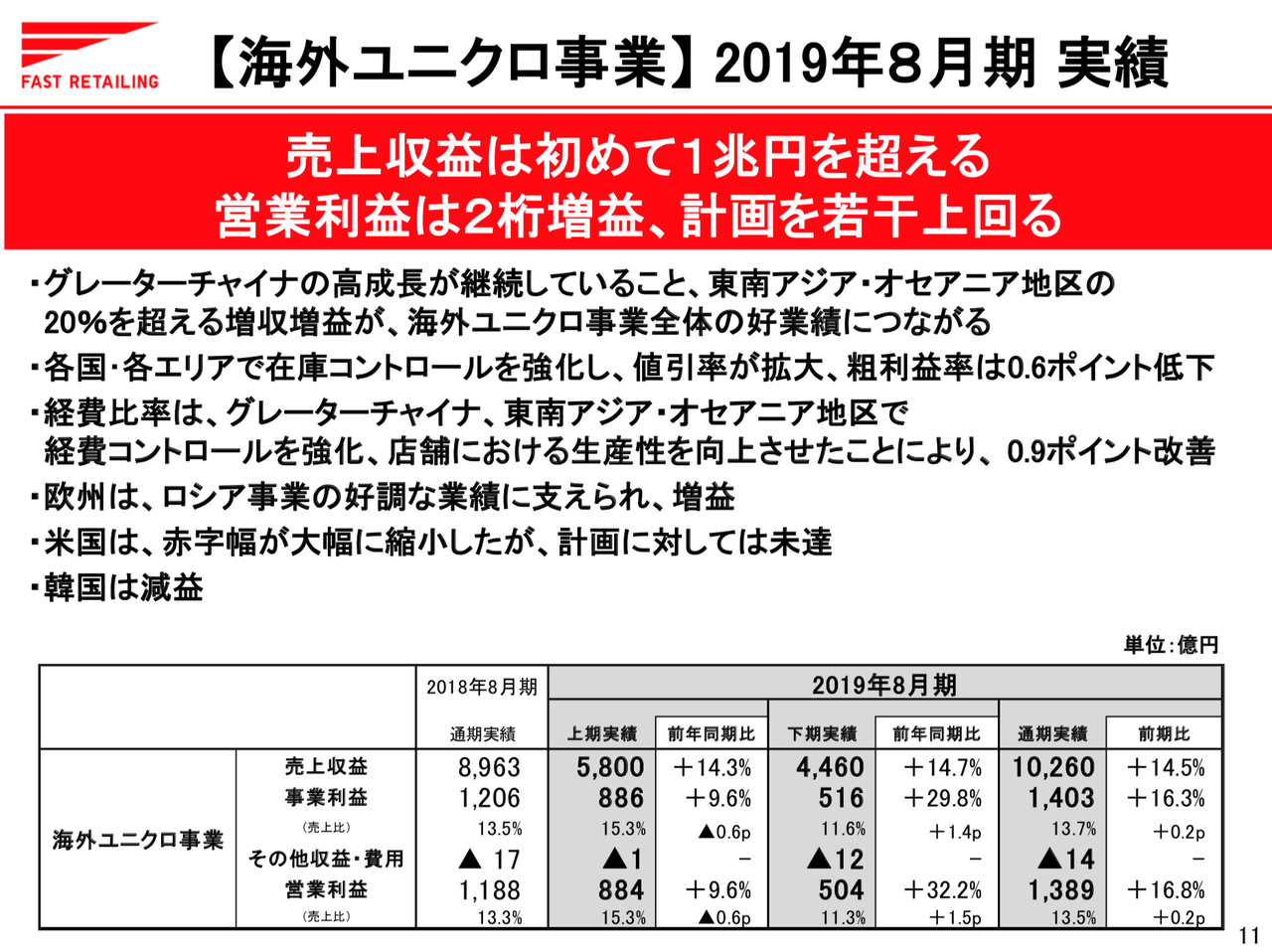で、海外ユニクロ事業。改めてですが、売上収益が初めて1兆円を超えております。営業利益は2桁増益を達成。