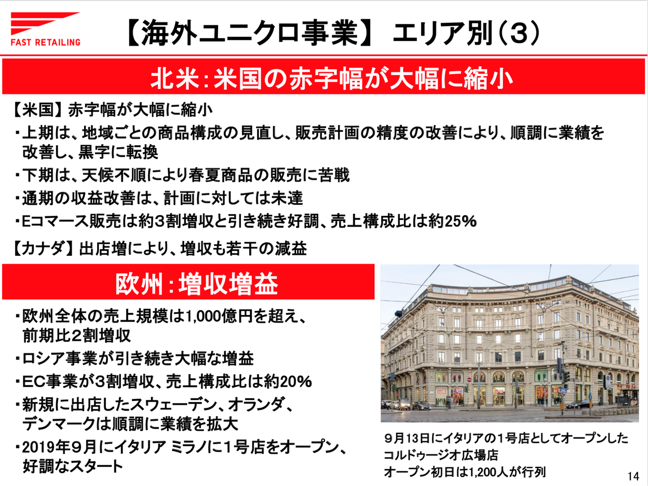 北米ですが、赤字幅が大幅に縮小したとのことですが、やや苦戦気味となっている模様。欧州は好調で、全体の売上規模は1,000億円を超えて前期比20%増収とのこと。2019年9月にミラノにオープンしたイタリア1号店は好調なスタートを切っている模様。
