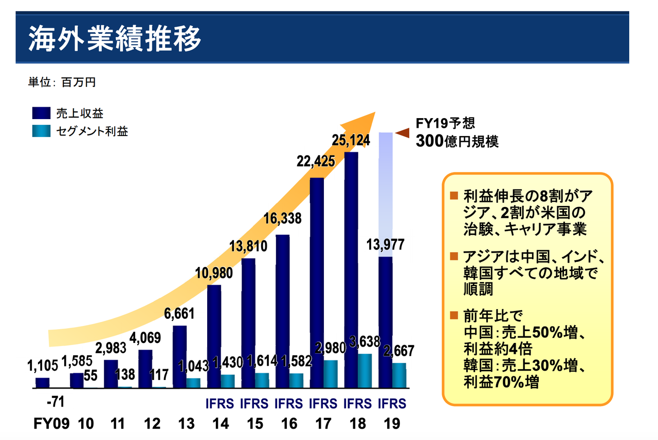 海外事業伸びております。利益伸長の8割がアジア、2割が米国の治験、キャリア事業となっておりますが、多くを占めるアジアは中国、インド、韓国すべての地域が順調で、好調ぶりが伺えます。