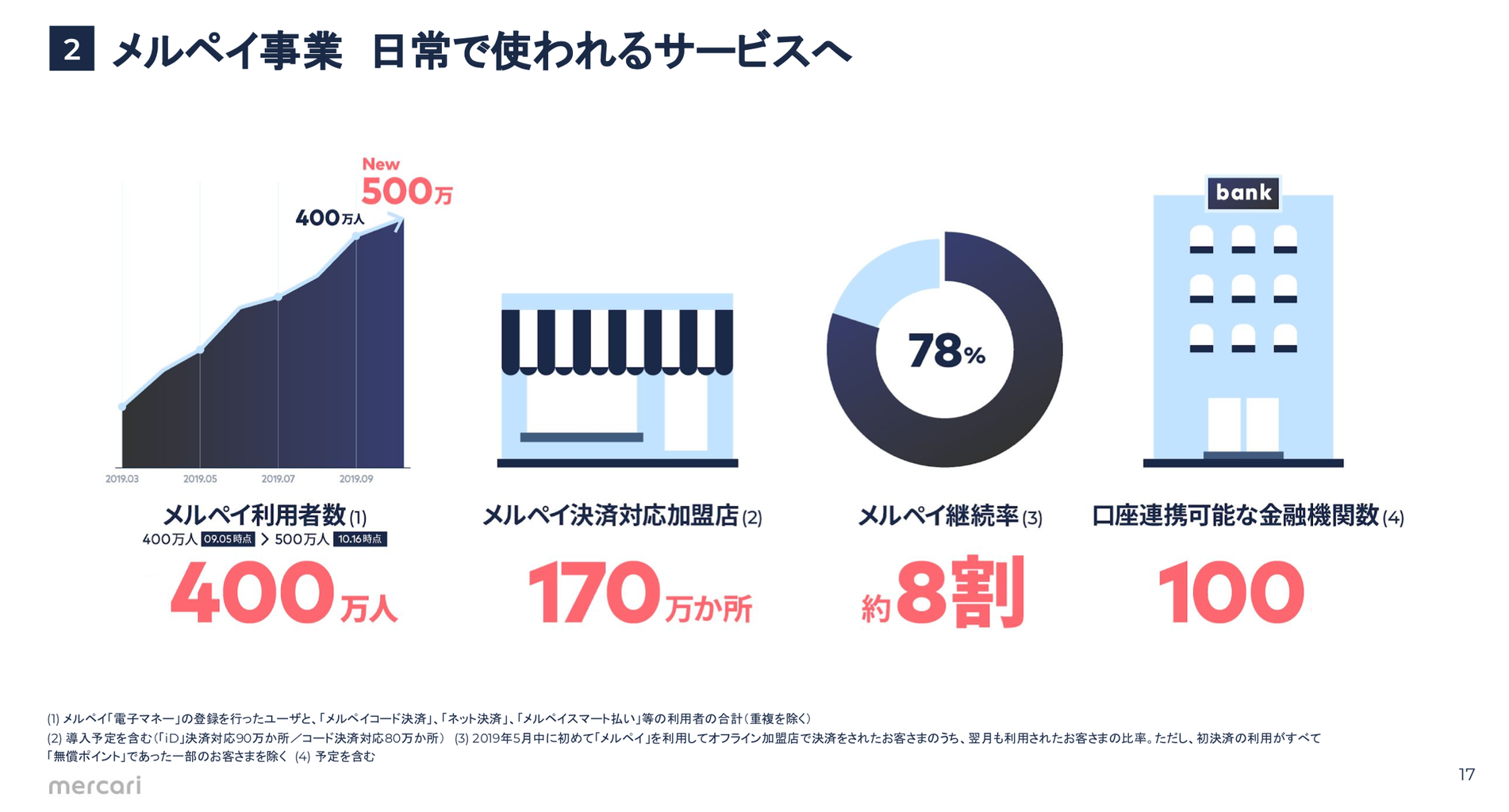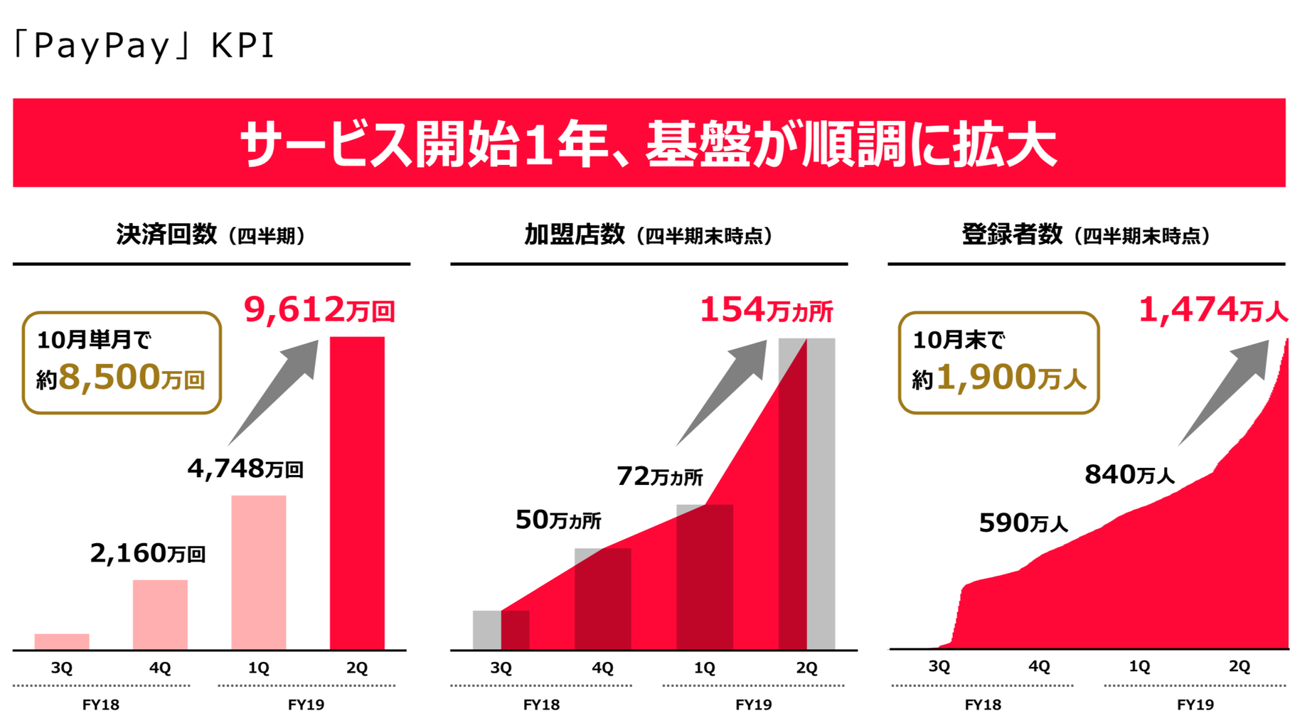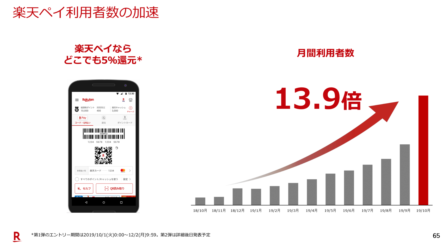 楽天ペイは資料や情報開示が現時点でほぼなく、このスライド1枚のみ。月間利用者数が13.9倍に伸びているというザックリとしたものになっております。ただ、グラフを見る限り10月の伸びが著しく、相当数のユーザー増加が発生しているものと思われます。今後の情報開示に期待ですね。