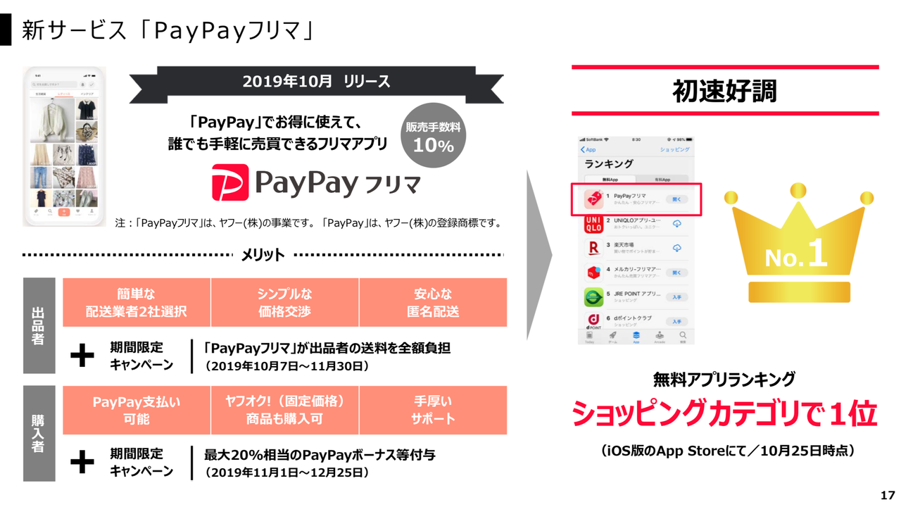 PayPayを冠したサービスとして「PayPayモール」と「PayPayフリマ」を共に10月にリリース。このあたりの展開はさすが。