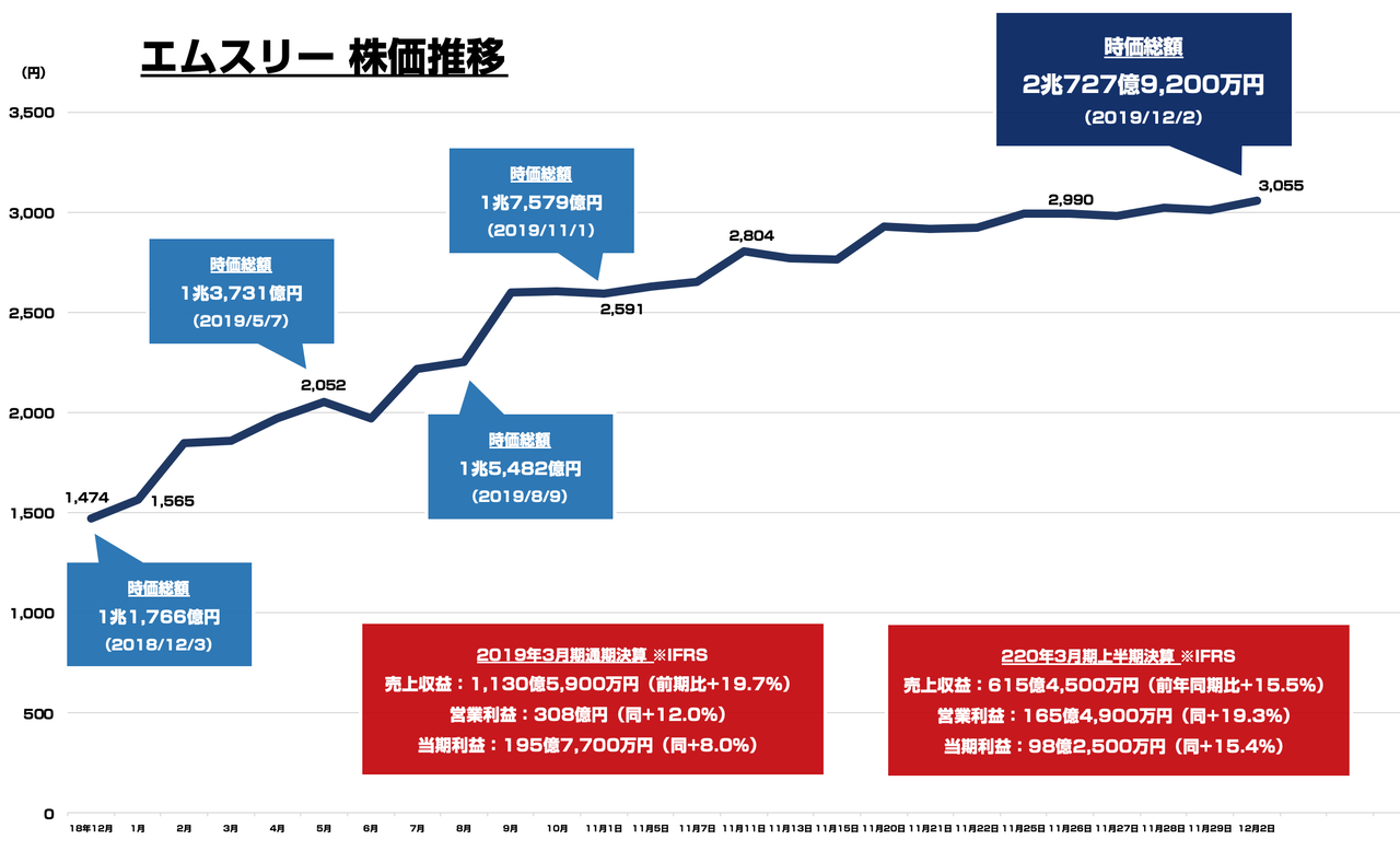 2019年10月までの月間と11月に入ってからの株価推移になります。業績もさることながら、株価も好調で 時価総額が2兆727億9,200万円(2019/12/2終値ベース)となっております。ちなみに、昨日も年初来高値を記録。現時点での近しい時価総額としては以下の通りで、住友商事、塩野義製薬、ニトリ、イオン、野村HDあたりを上回る規模感となっております。あくまで現時点ですが。