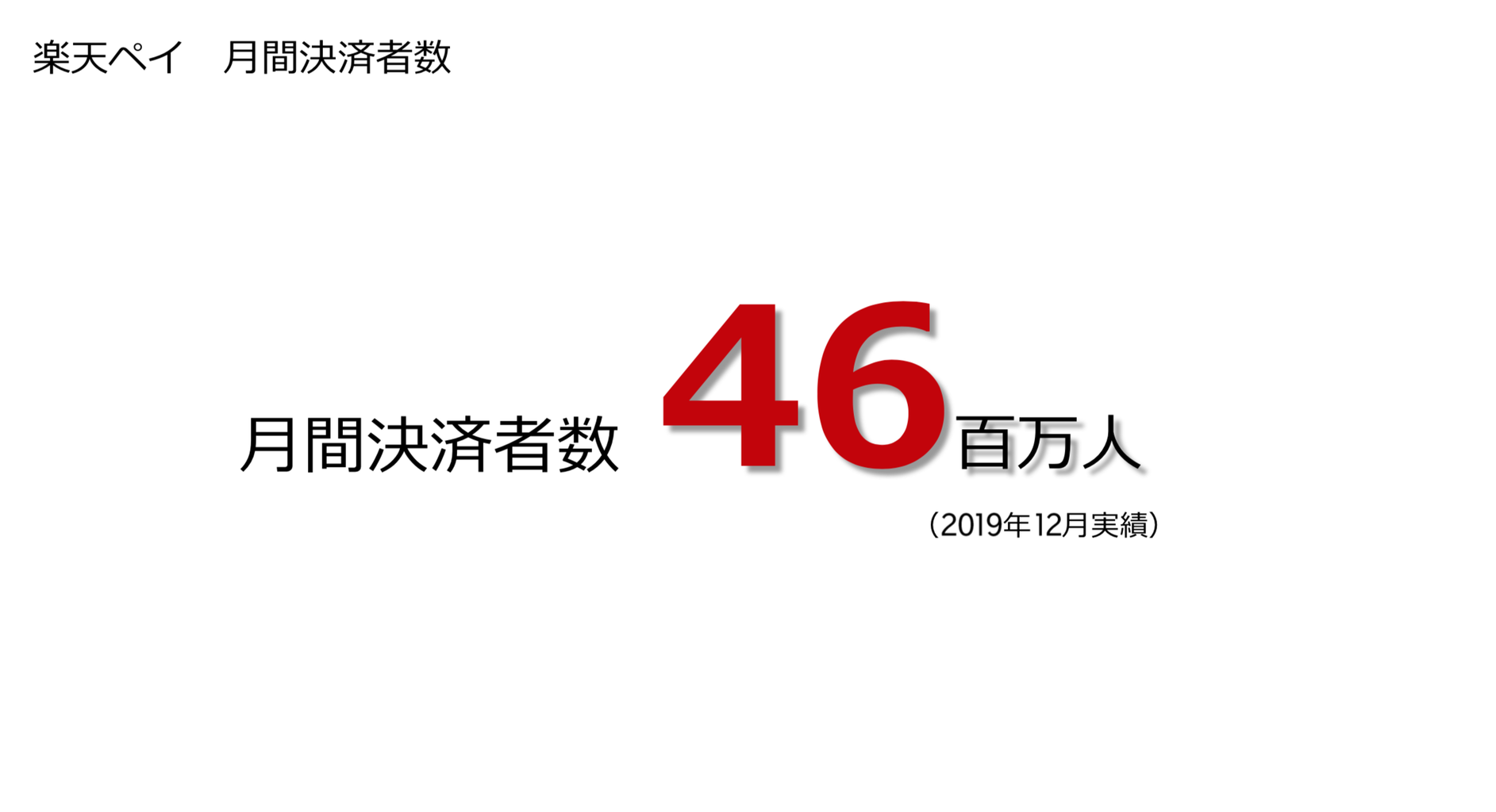 楽天ペイは資料や情報開示が現時点でほぼなく、このスライド1枚のみ。(前回もでしたが、さらにシンプルな資料に)月間決済者数が4,600万人(2019年12月実績)とのこと。今後の情報開示に期待。
