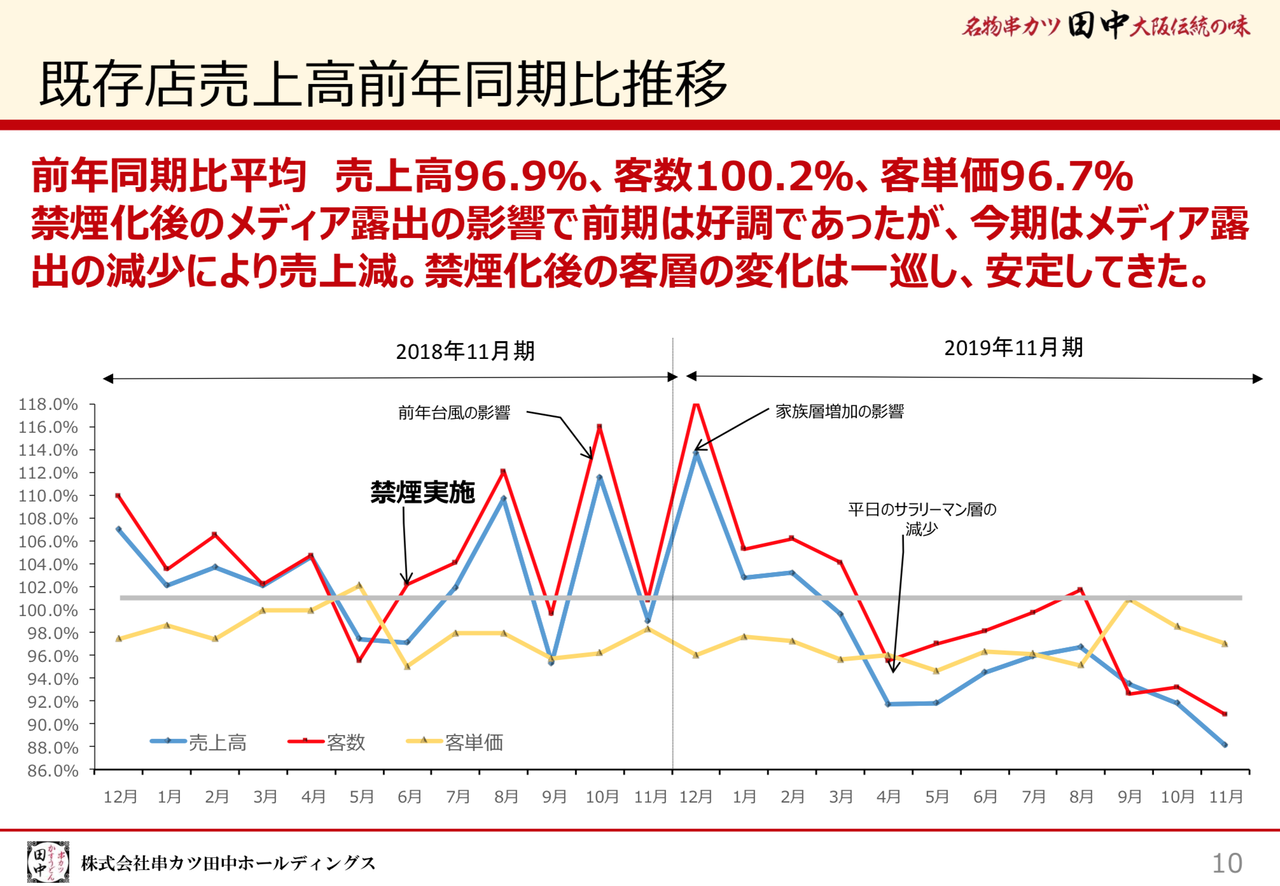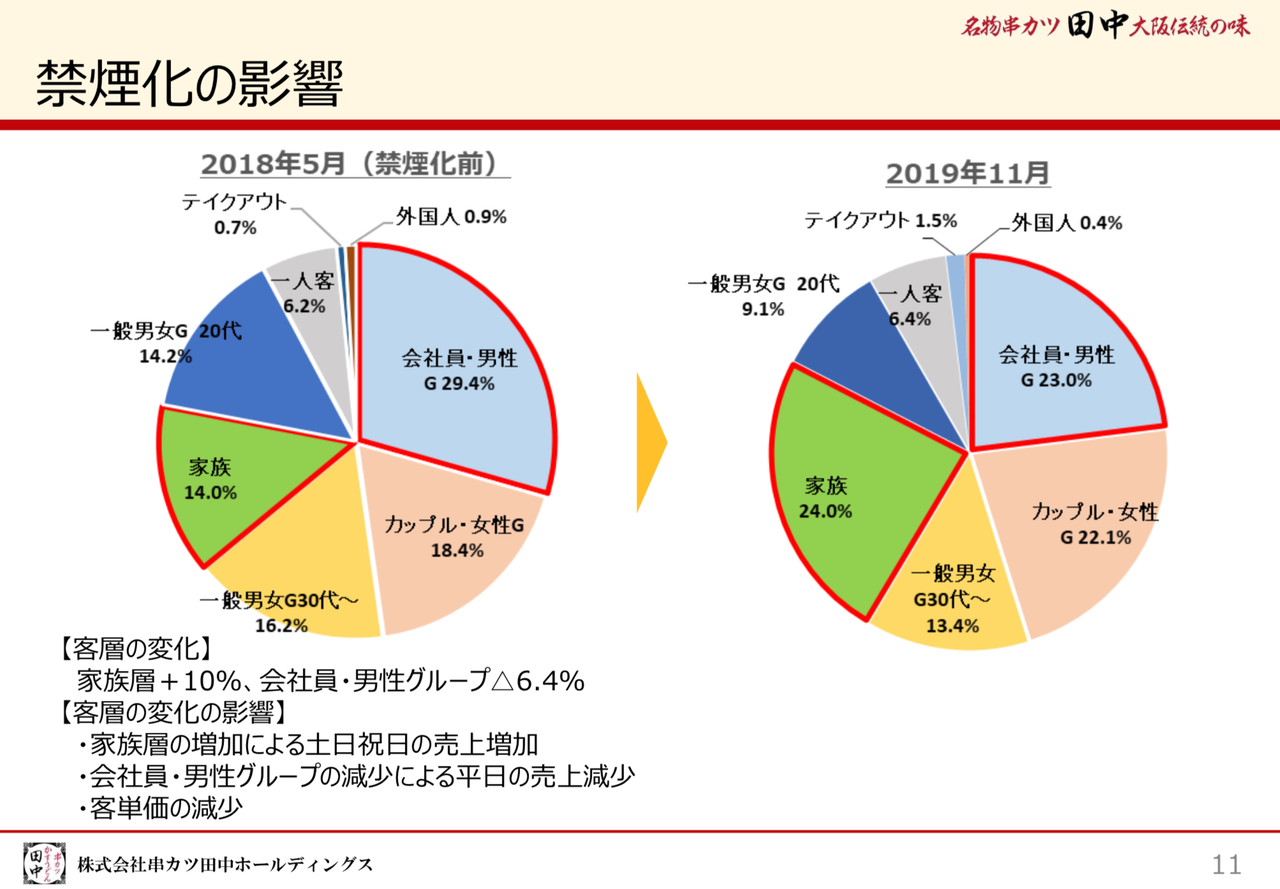 串カツ田中がほぼ全店における禁煙化に踏み切ったのが2018年6月。あれから2年が経とうとしておりますが、どんな変化があるのか見たいと思います。少し古い資料で恐縮ながら 上記は今年1月に発表された串カツ田中ホールディングスの2019年11月期通期決算の資料ですが、まず客層の変化について整理したいと思います。