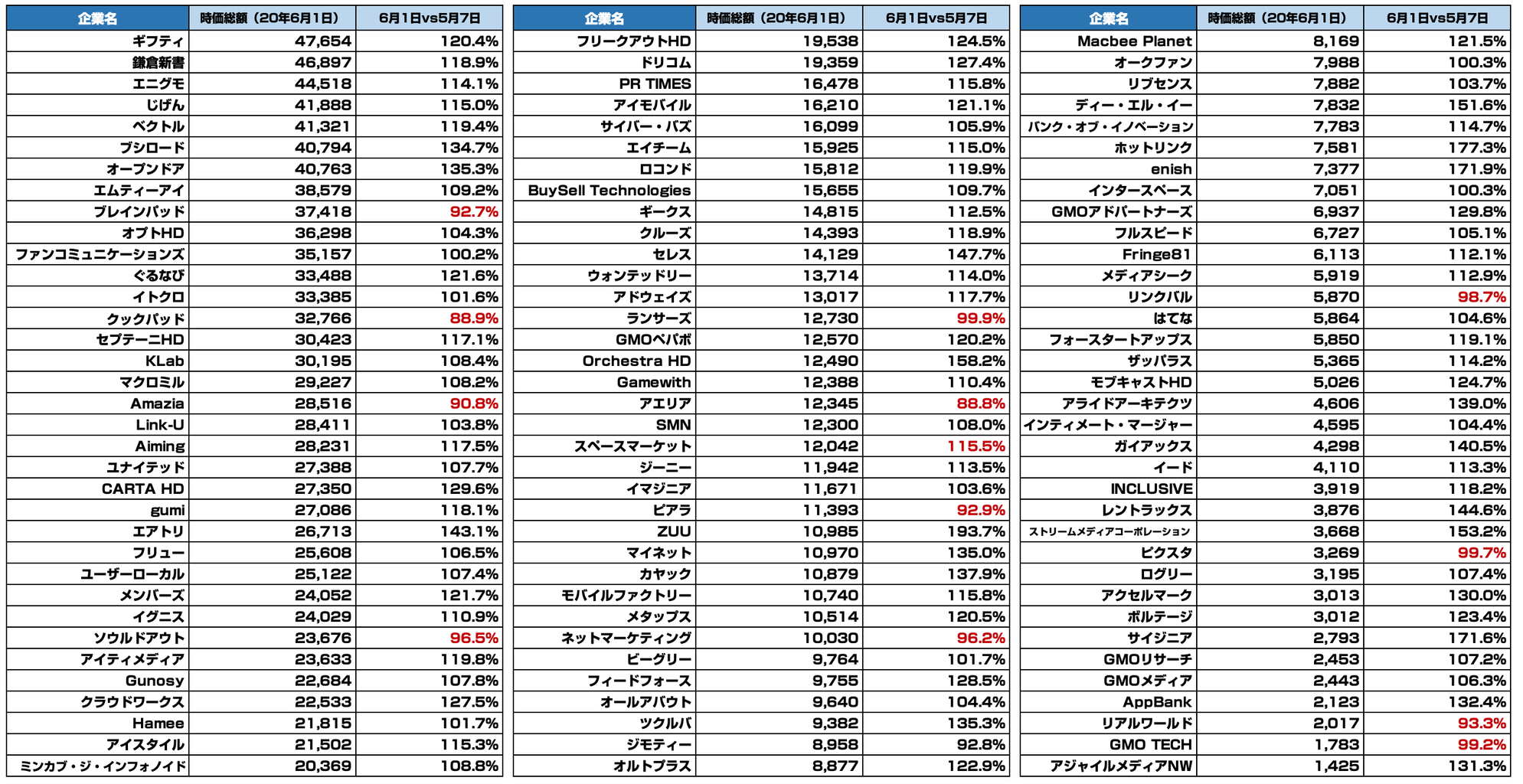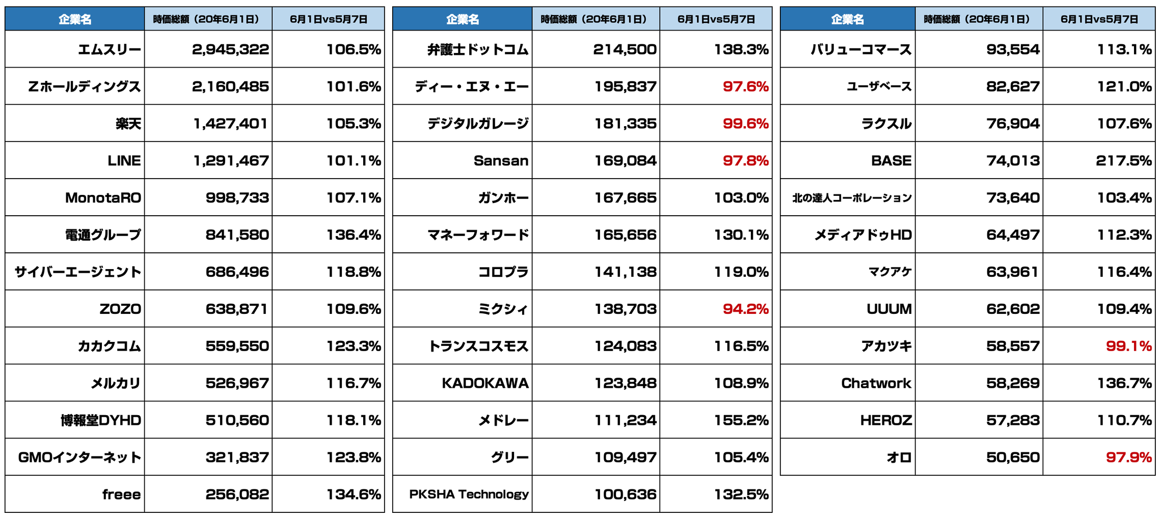 6月1日時点(2020/6/1終値ベース)での時価総額になります。