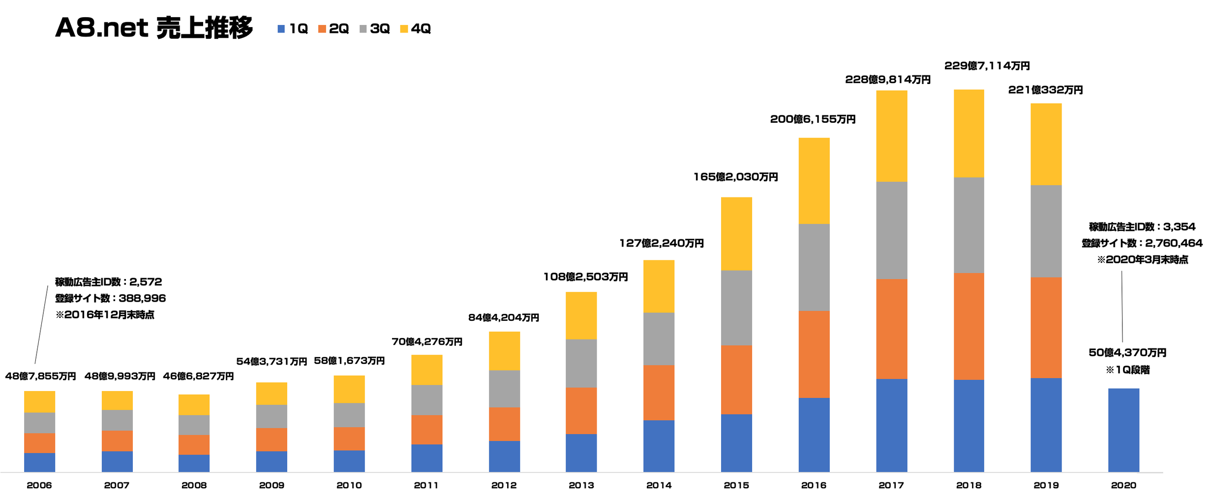 改めてですが、A8.netはアフィリエイトのサービスで、公式サイトによると提供開始が2000年6月という ファンコミュニケーションズ創業期からあるプロダクトです。上記は15年間の数字になりますが、2012年あたりから一段と売上が上昇していくのがよくわかります。2013年に売上100億円を、その3年後の2016年には売上200億円をそれぞれ突破しております。20年サービスがあり続けることがそもそも大きなハードルですが、20年経った今なお 数字を大きく落とすこともなく 成長させ続けている点が素晴らしいですね。