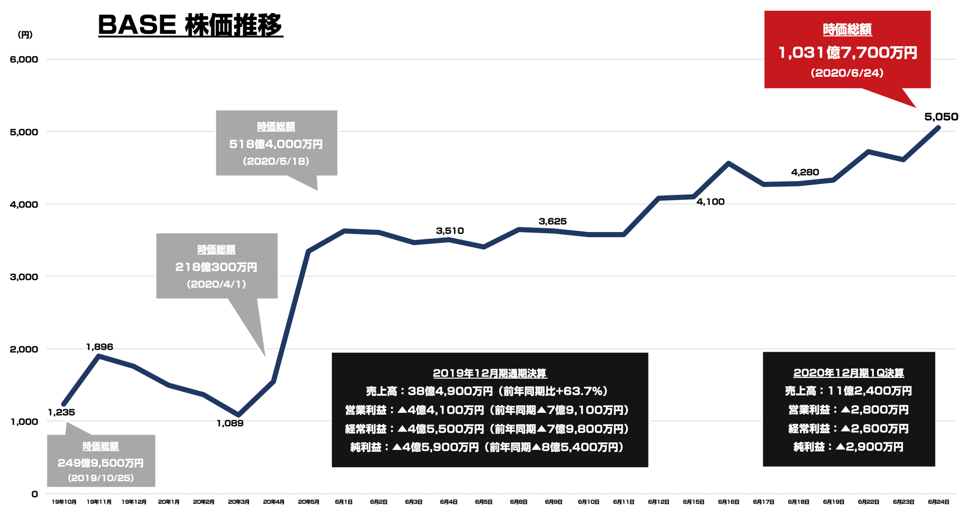本日の終値ですが、上場来の最高値を更新しまして5,050円となり時価総額が1,031億7,700万円(2020/6/24終値ベース)となっております。1ヶ月ほど前の5/18に時価総額500億円を突破したというエントリーを書いておりますが、約1ヶ月でさらに500億円を積んできた形になります。リリースも続々と出ておりまして、直近ですと越境ECに対応を開始しており、海外という文脈も出てきております。これからも大注目のBASE 引き続き追いかけてまいります。
