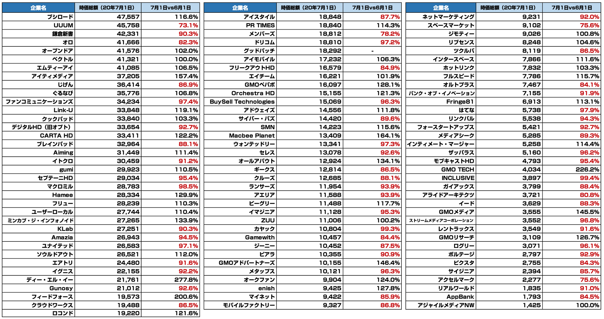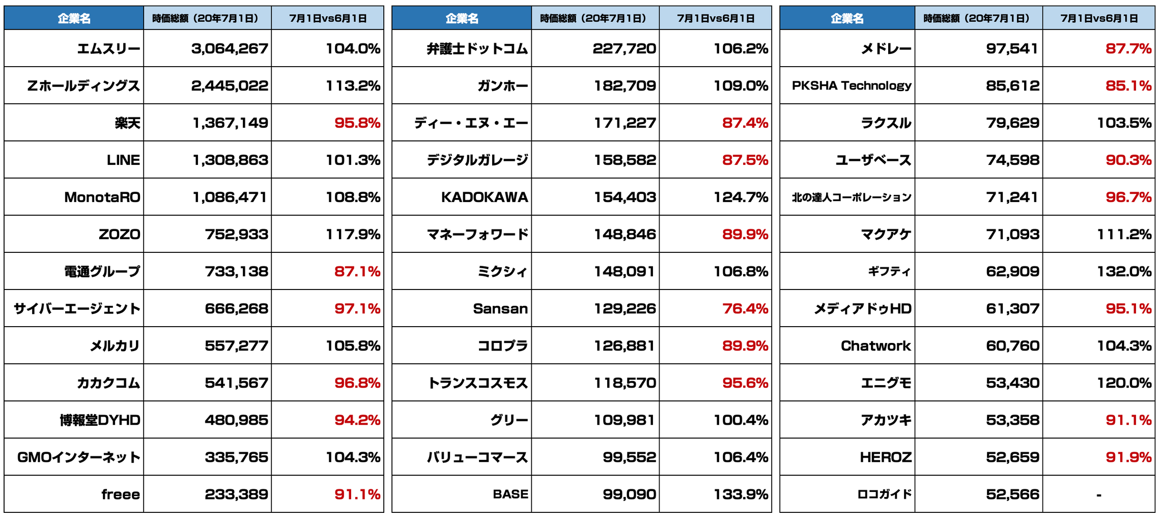 7月1日時点(2020/7/1終値ベース)での時価総額になります。