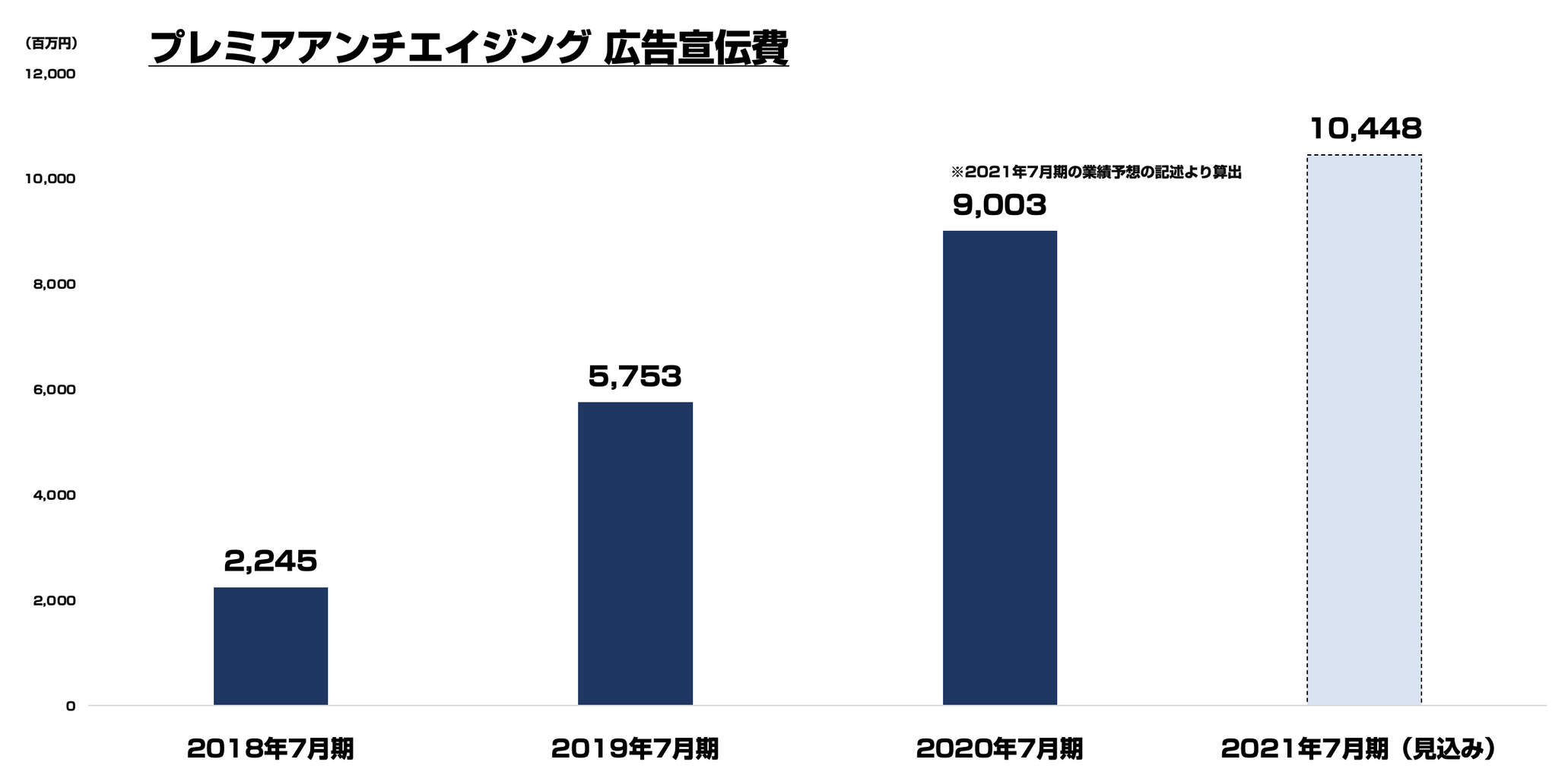 続いて 広告宣伝費の推移ですが、こちらも売上に比例する形で右肩に上がっております。最新2020年7月期は 先日プレスリリースで出た「2021年7月期の業績予想」の記述より算出しておりますので あくまで参考値ですが、約90億円程度の広告宣伝費が投資されているものと思われます。また2021年7月期は104億4800万円の宣伝費が見込まれております。KinKi Kidsさんや米倉涼子さんを起用するなどキャスティングも大物起用となっており、コストとしては高い水準にあると思います。