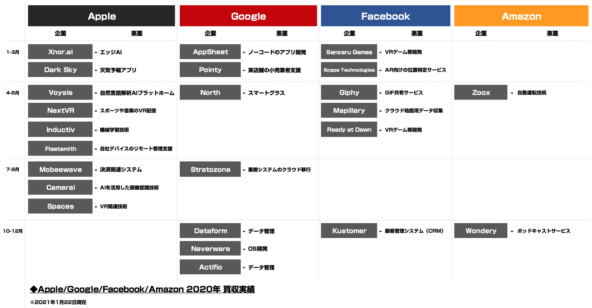 例年書いている買収周りのまとめを。世界的テック企業4社でありますGAFA(Google、Apple、Facebook、Amazon)の 2020年の買収動向をまとめたいと思います。まずはタイムラインからザッと振り返ります。