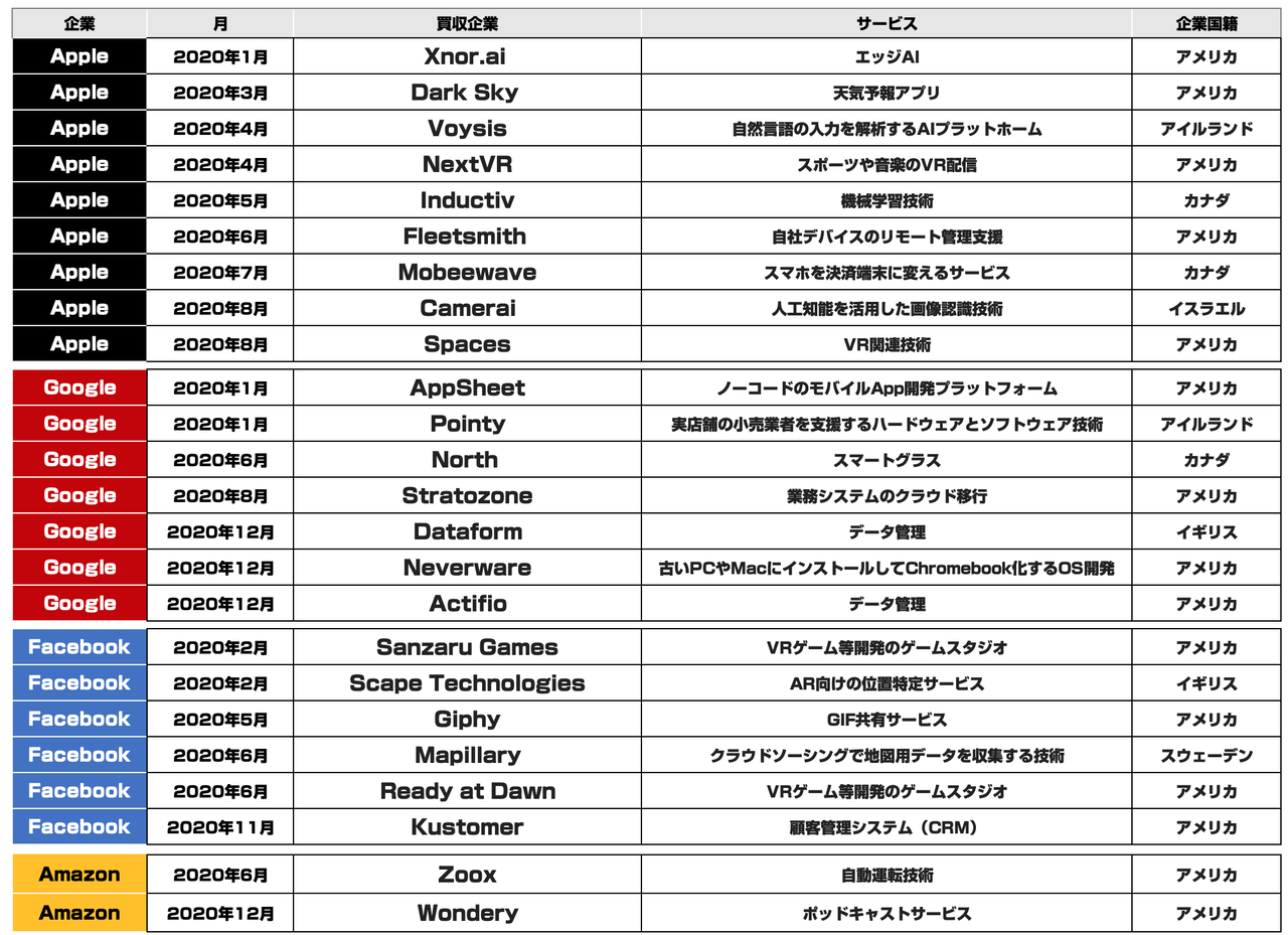 GAFAによる2020年に行われた買収は全部で24事案。Apple9社、Google7社、Facebook6社、Amazon2社。上半期は15事案でしたので、例年と比較するとハイペースな印象がありましたが、下半期は9事案とそこまでM&A件数は伸びず。なお、2019年は全体で24事案でしたので、数としては前期比で横ばいとなりました。(抜け漏れあったらすみません)