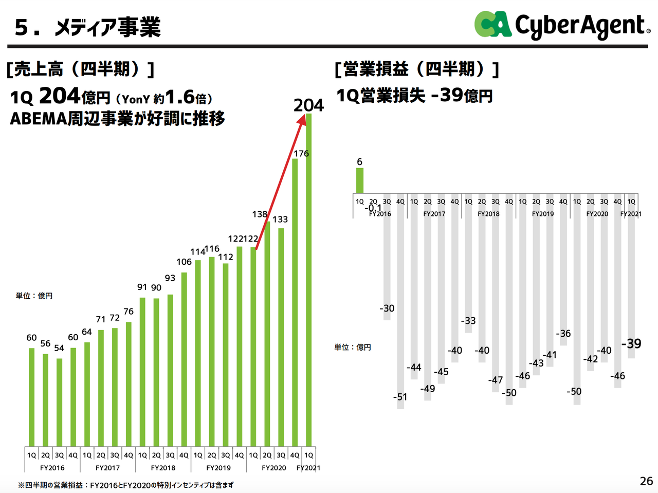 メディア事業全体としては、ネット投票含めてABEMA全体が好調で、四半期売上が204億円(YonY約1.6倍)まで伸びてきております。引き続き投資先行ではありますが、有料会員数も92.1万人(12月末時点)まで伸びるなど着実に成長しております。今期は一気にマネタイズが進みそうですね。今年も追いかけます。