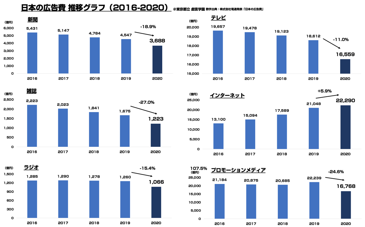 上記、マスコミ4媒体、インターネット、プロモーションメディアの合計6カテゴリをまとめたものになります。コロナ禍の一年でグラフが例年と比較して大きく下がっているカテゴリが多い状況となりました。ただし、インターネットカテゴリに関しては2020年も5.9%成長と伸びを見せております。
