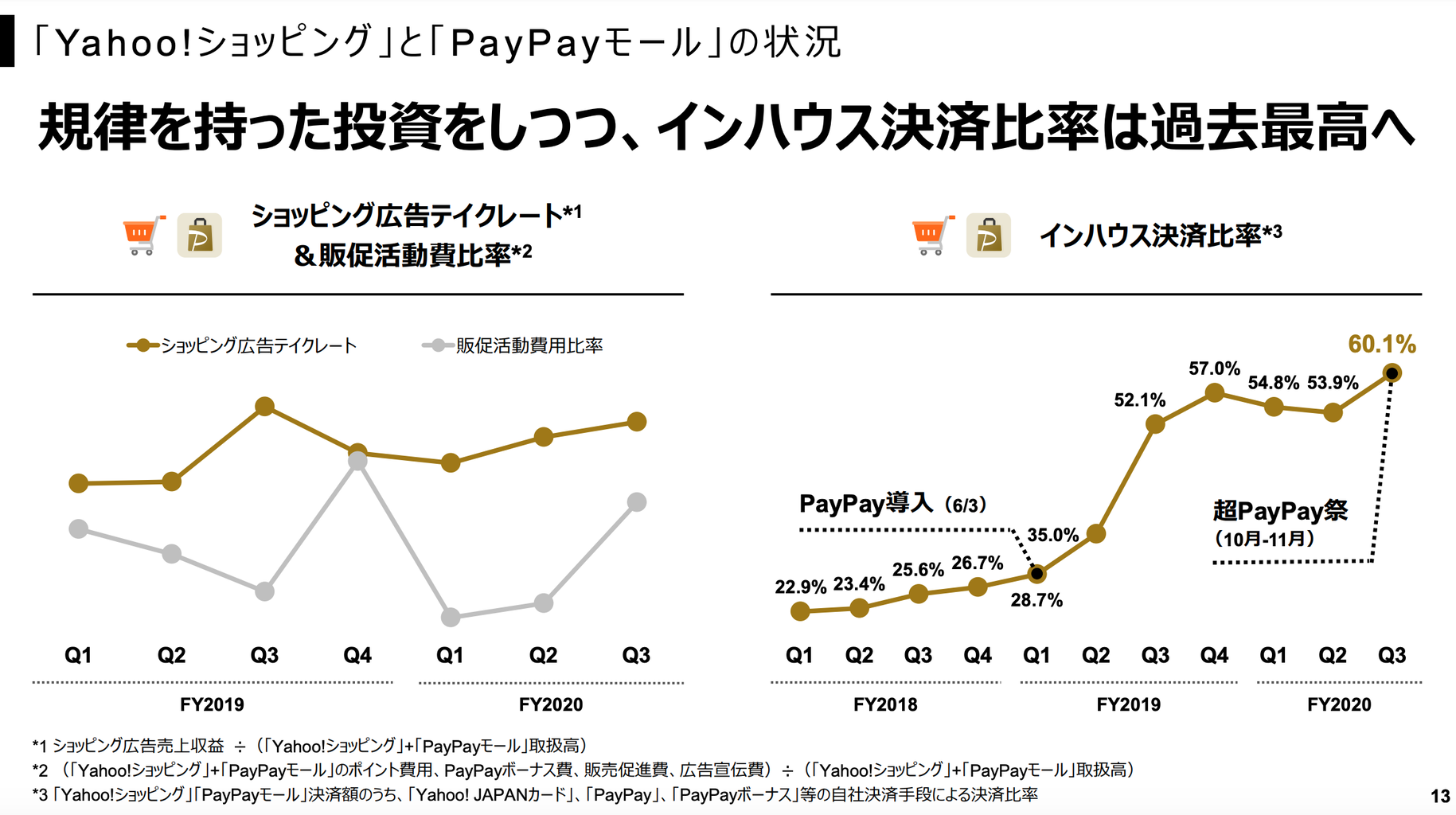 具体的にはYahoo! JAPANカード、PayPay、PayPayボーナス等になりますが、こうした自社決済が自社ショッピングサイト「Yahoo!ショッピング」と「PayPayモール」でどの程度使われているのか、いわゆる "インハウス決済比率"について見ていきたいと思います。